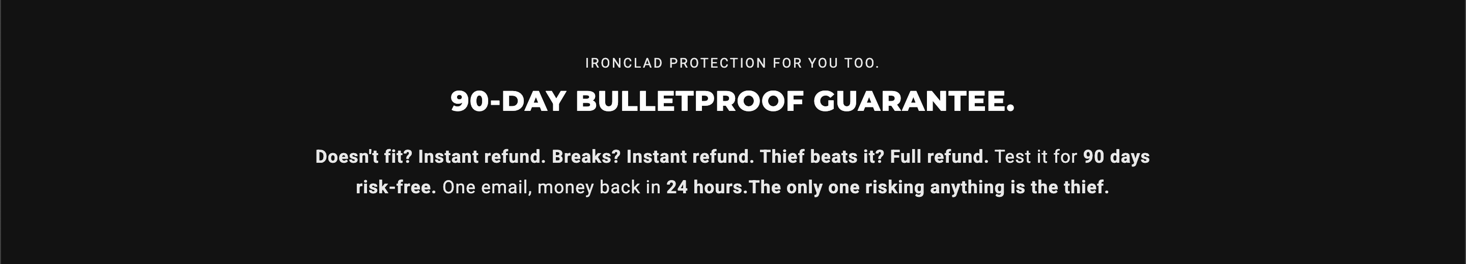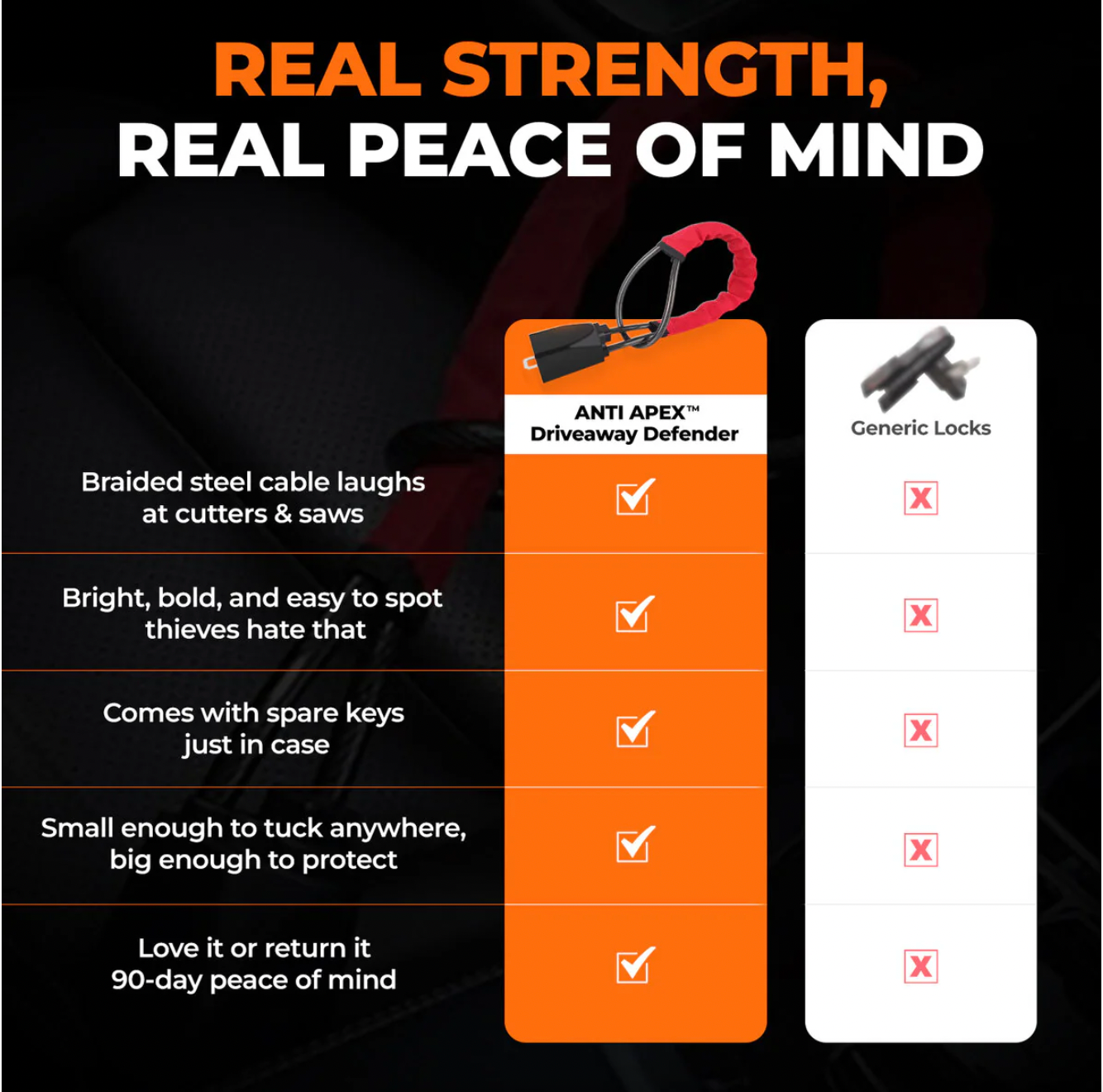 5 mm military-grade steel that’s beaten every tool tested — bolt cutters, hacksaws, pry bars. All failed. PVC-coated to protect your interior, weatherproofed for 40° summers and winter storms. Small enough to chuck in your door pocket, tough enough to ruin a thief’s night.